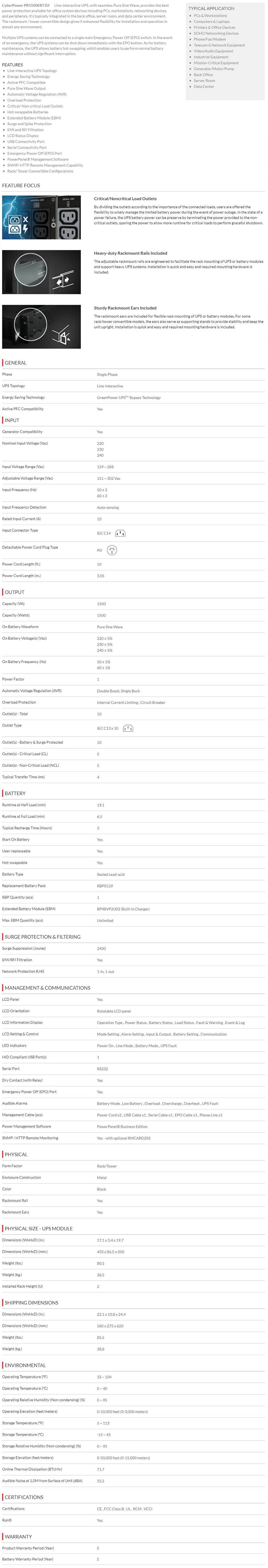 GENERALPhase: Single PhaseUPS Topology: Line-interactiveEnergy Saving Technology: GreenPower UPS™ Bypass TechnologyActive PFC Compatibility: YesINPUTGenerator Compatibility: YesNominal Input Voltage (Vac): 220/230/240 Input Voltage Range (Vac): 159 ~ 288Adjustable Voltage Range (Vac): 151 ~ 302 VacInput Frequency (Hz): 50 ± 3 60 ± 3Input Frequency Detection: Auto-sensingRated Input Current (A): 10Input Connector Type: IEC C14Detachable Power Cord Plug Type: AUPower Cord Length (ft.): 10Power Cord Length (m.): 3.05OUTPUTCapacity (VA): 1500Capacity (Watts): 1500On Battery Waveform: Pure Sine WaveOn Battery Voltage(s) (Vac): 220 ± 5%/230 ± 5%/240 ± 5%On Battery Frequency (Hz): 50 ± 1% 60 ± 1%Power Factor: 1Automatic Voltage Regulation (AVR): Double Boost, Single BuckOverload Protection: Internal Current Limiting, Circuit BreakerOutlet(s) – Total: 10Outlet Type: IEC C13 x 10Outlet(s) - Battery & Surge Protected: 10Outlet(s) – Critical Load (CL): 5Outlet(s) – Non –Critical Load (NCL): 5Typical Transfer Time (ms): 4BATTERYRuntime at Half Load (min): 18.3Runtime at Full Load (min): 6Typical Recharge Time (Hours): 3Start on Battery: YesUser-replaceable: YesHot-swappable: YesBattery Type: Sealed Lead-acidReplacement Battery Pack: RBP0129RBP Quantity (pcs): 1PHYSICALForm Factor: Rack/TowerRackmount Rail: YesRackmount Ears: YesDimensions (WxHxD) (mm.): 560 x 275 x 530Weight (kg.): 31.5