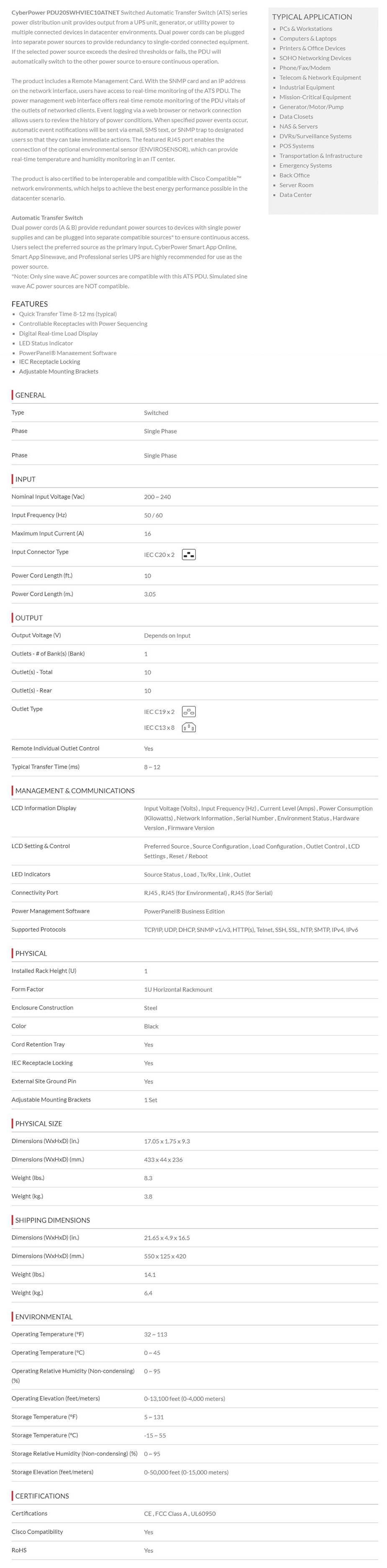Description Cyberpower Pdu20swhviec10atnet 1u Switched Ats 16amp Input/output -(pdu20swhviec10atnet)- Snmp Network Connection - 8x Iec C13 & 2x Iec C19 Out - Iec 320 C20*2 In - 2 Years Wty