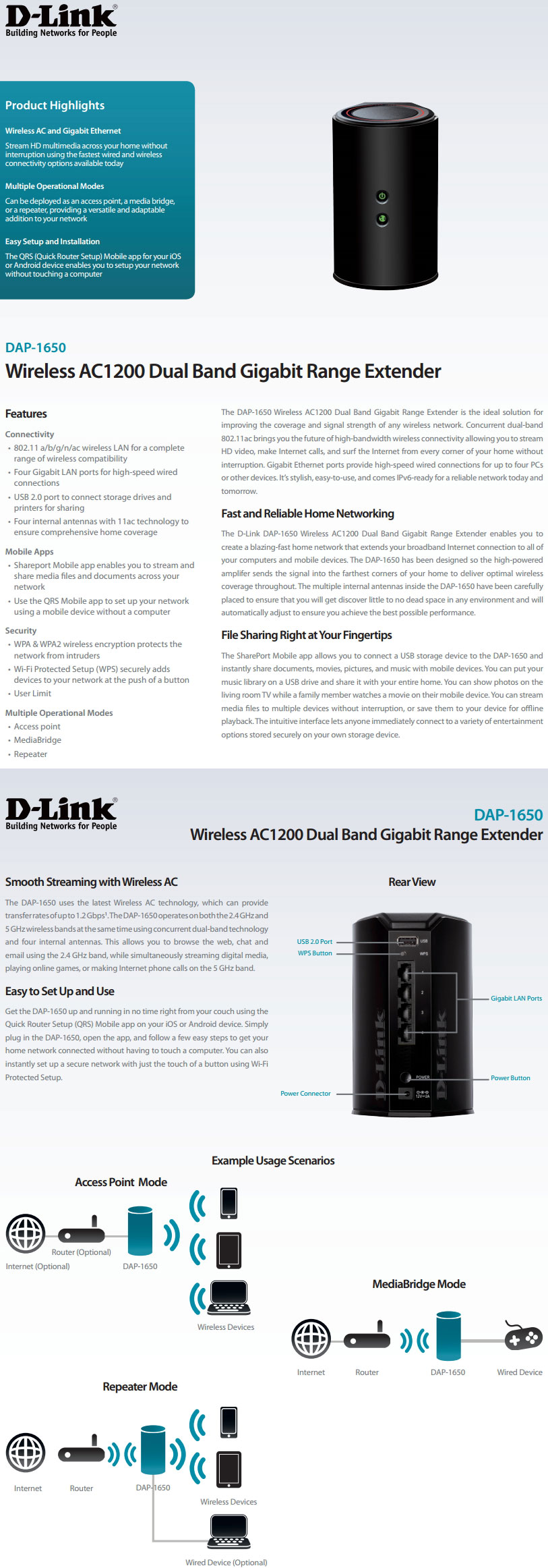 Product Name | D-Link DAP-1650 Wireless AC1200 Dual Band Gigabit Ethernet Range Extender |