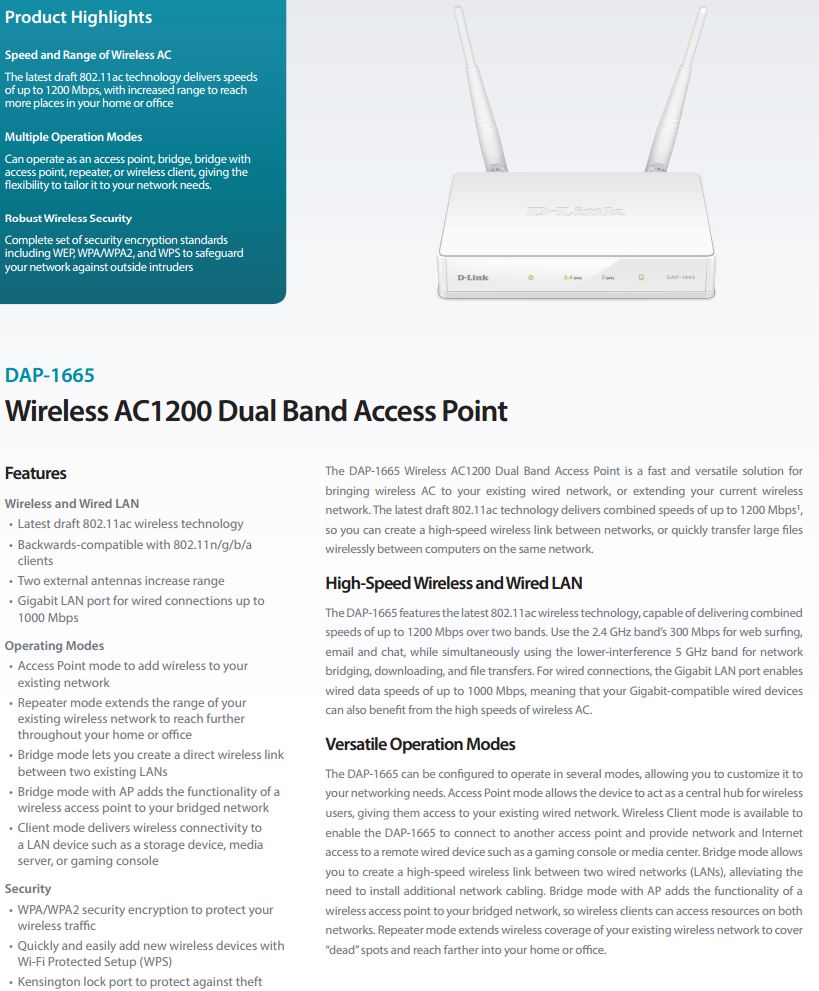 Product Name | D-Link DAP-1665 Wireless AC1200 Dual Band Access Point |