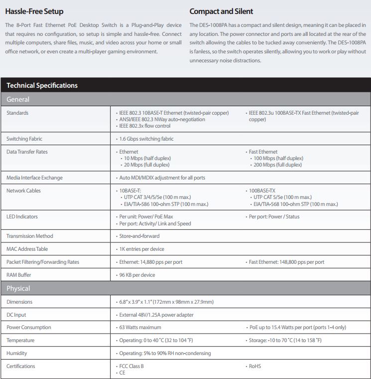High-Speed Networking • Eight 10/100 Mbps Fast Ethernet ports • Full/half-duplex for Ethernet/Fast Ethernet speeds Power-over-Ethernet • IEEE 802.3af PoE • 4 PoE ports, each supporting up to 15.4W • PoE budget of 52W Reliability • IEEE 802.3x fl ow control • Store-and-forward switching scheme • RoHS compliant Easy Setup • Plug-and-play installation • Auto MDI/MDIX crossover for all ports Convenient Design • Compact lightweight chassis • Ports located conveniently at the rear • Silent operation |