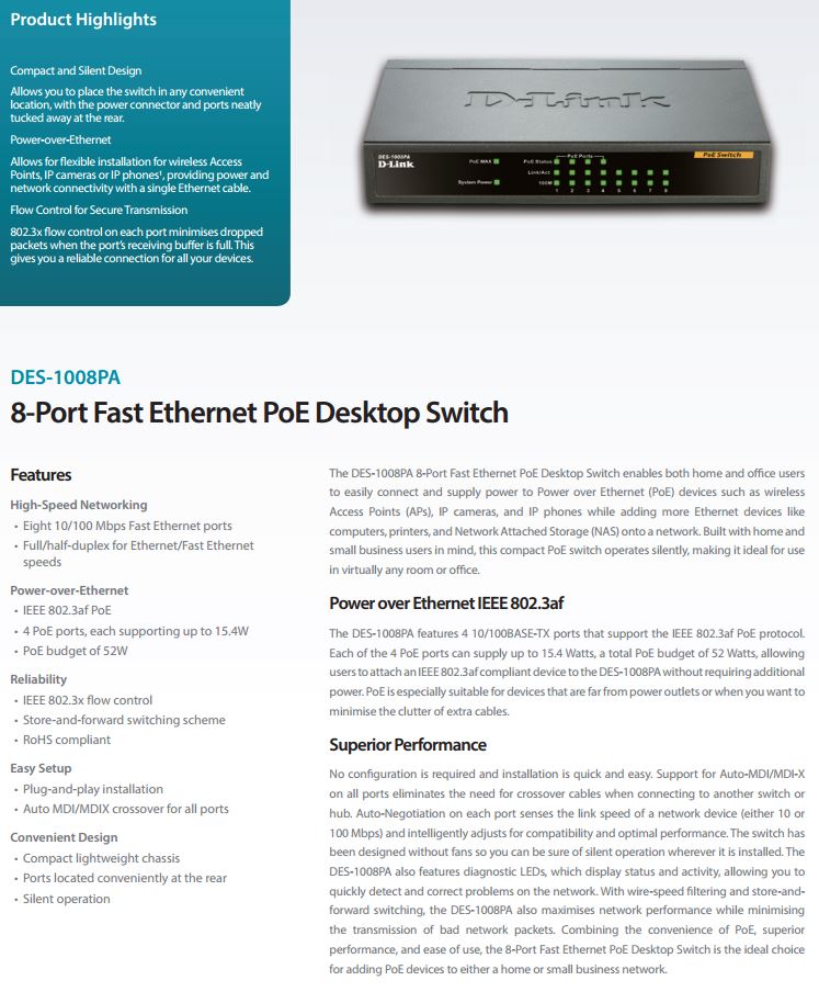 Product Name | D-link Des-1008pa 8-port 10/100 Desktop Switch With 4 Poe |