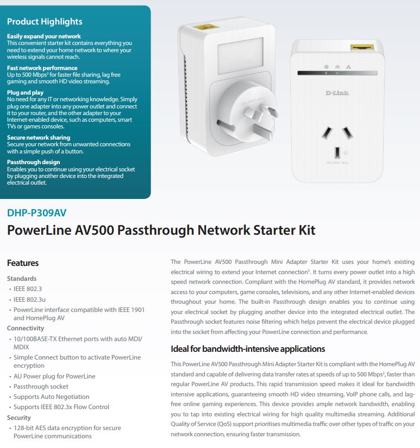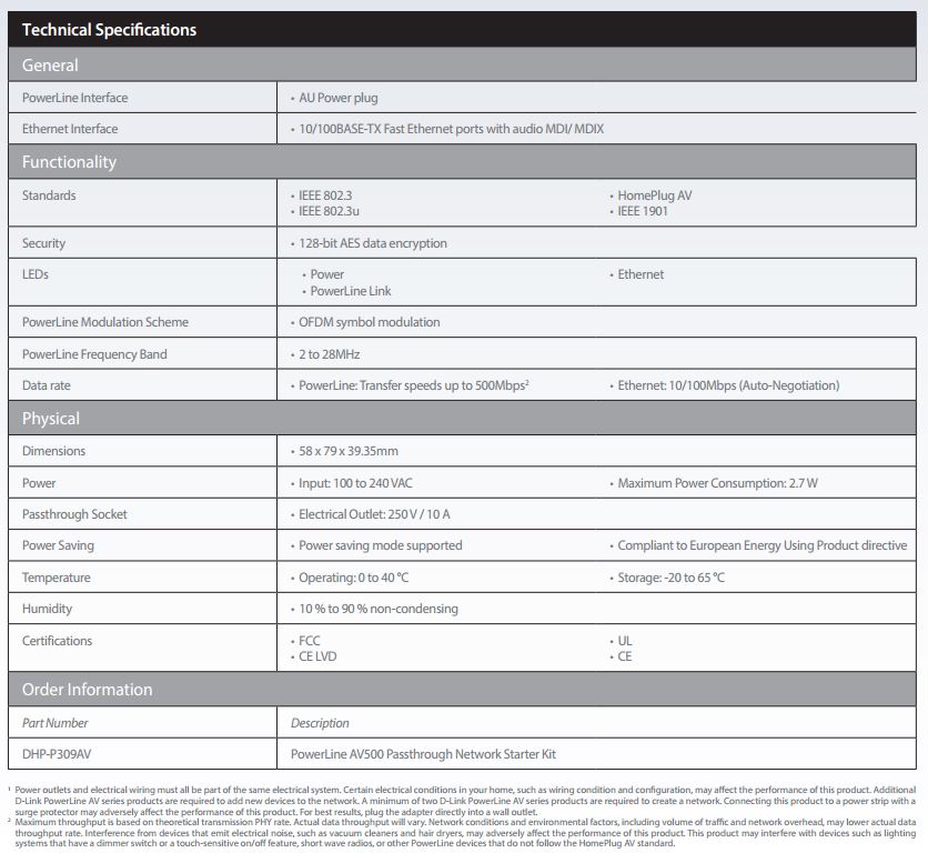 Product Name | D-Link DHP-P309AV PowerLine AV 500 Passthrough Mini Adapter Starter Kit |
