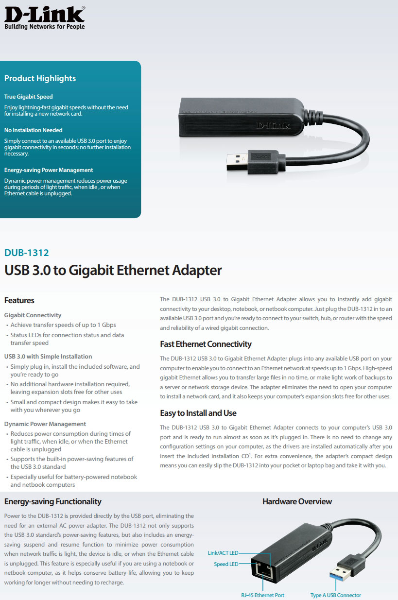 Description D-link Dub-1312 Usb 3.0 To Gigabit Ethernet Adapter