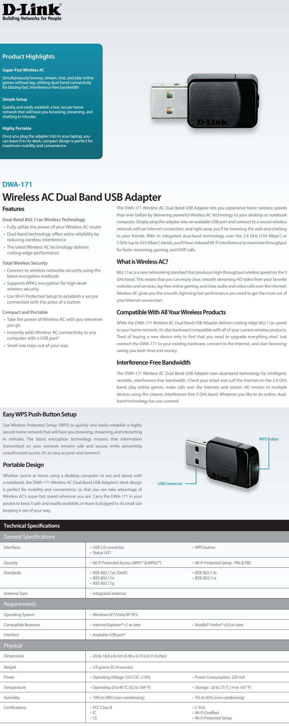 The Wireless AC Dual Band Nano USB Adapter (DWA-171) delivers powerful wireless AC technology to your desktop or notebook computer. Simply plug the adapter into an available USB port and connect to a wireless network to access a secure, high-speed internet connection – 2.4GHz (150Mbps*) or 5GHz (up to 433Mbps*). And with integrated Dual Band technology, you’ll have reduced Wi-Fi interference to maximize throughput for faster streaming, gaming, and Skype calls.