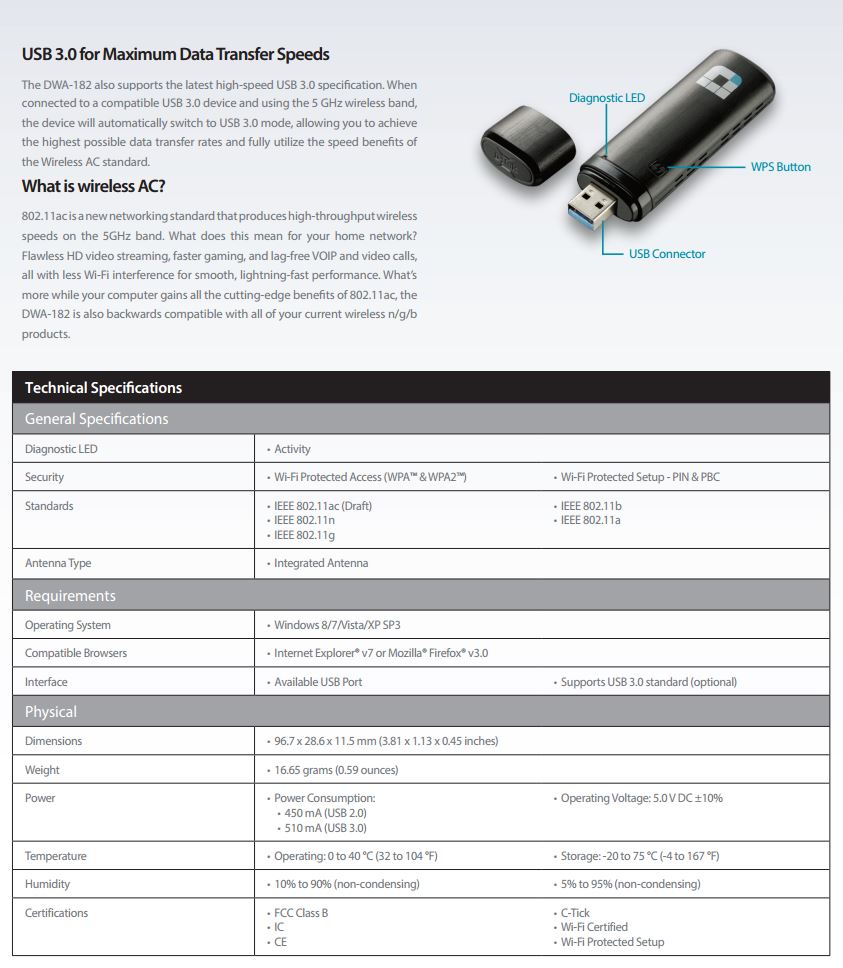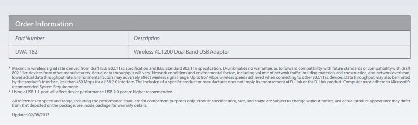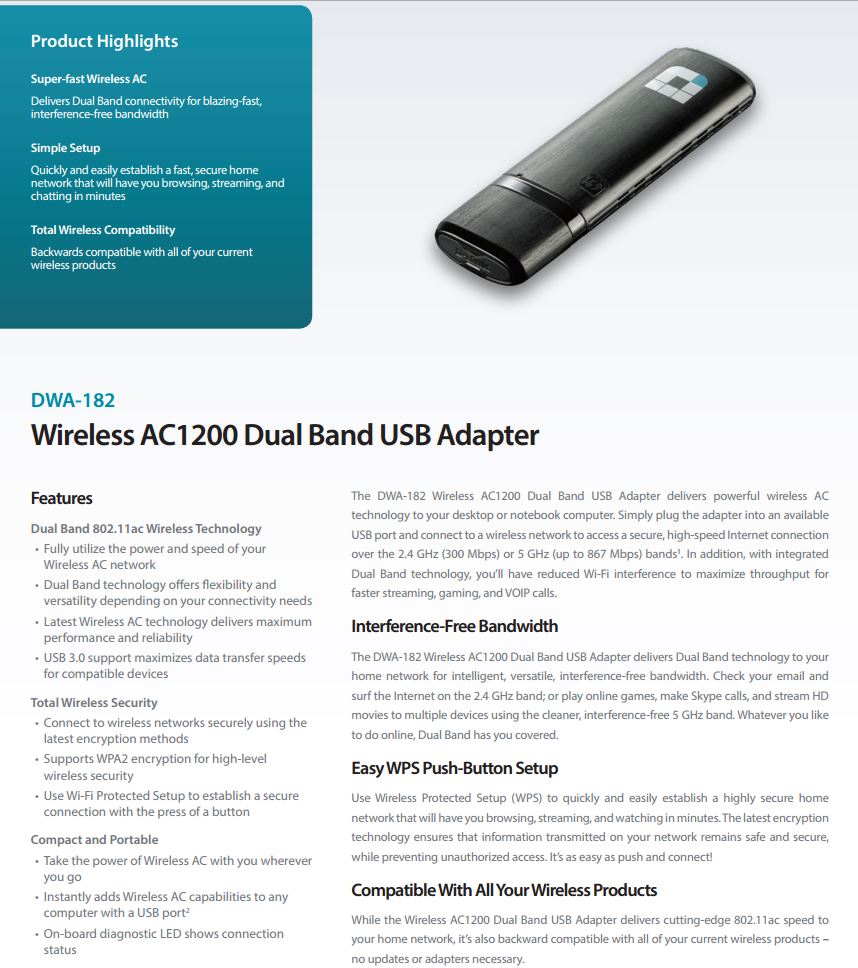 Product Name | D-Link DWA-182 Wireless AC1200 Dual Band USB Adapter |