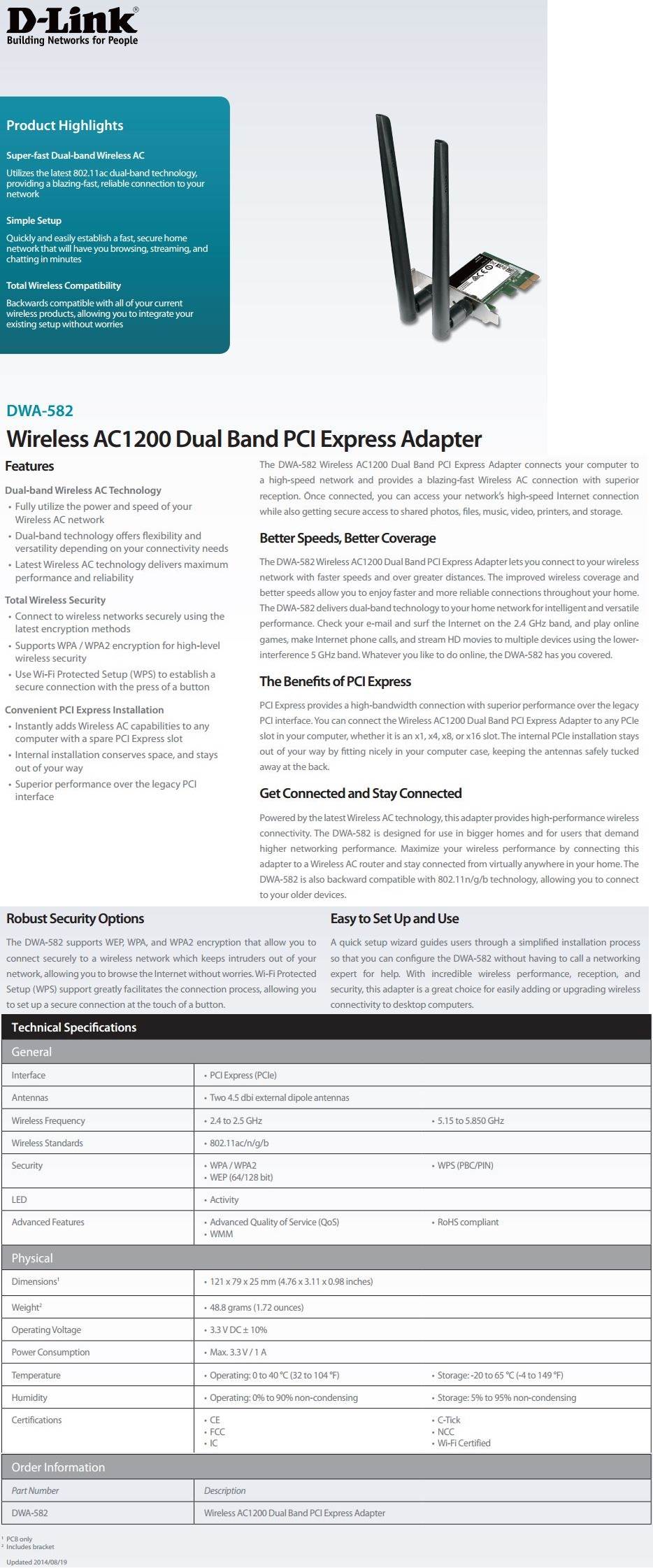 Product Name | D-Link DWA-582 Wireless AC1200 Dual Band PCIe Adapter |