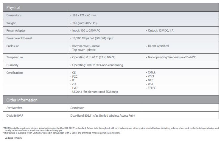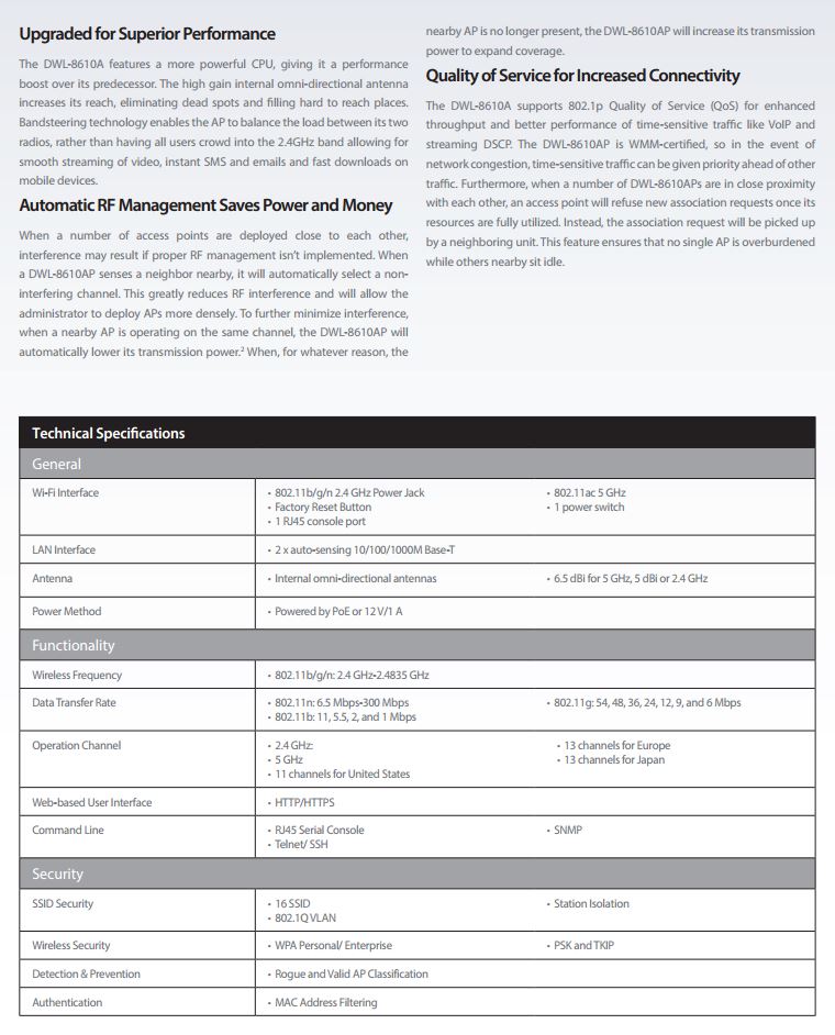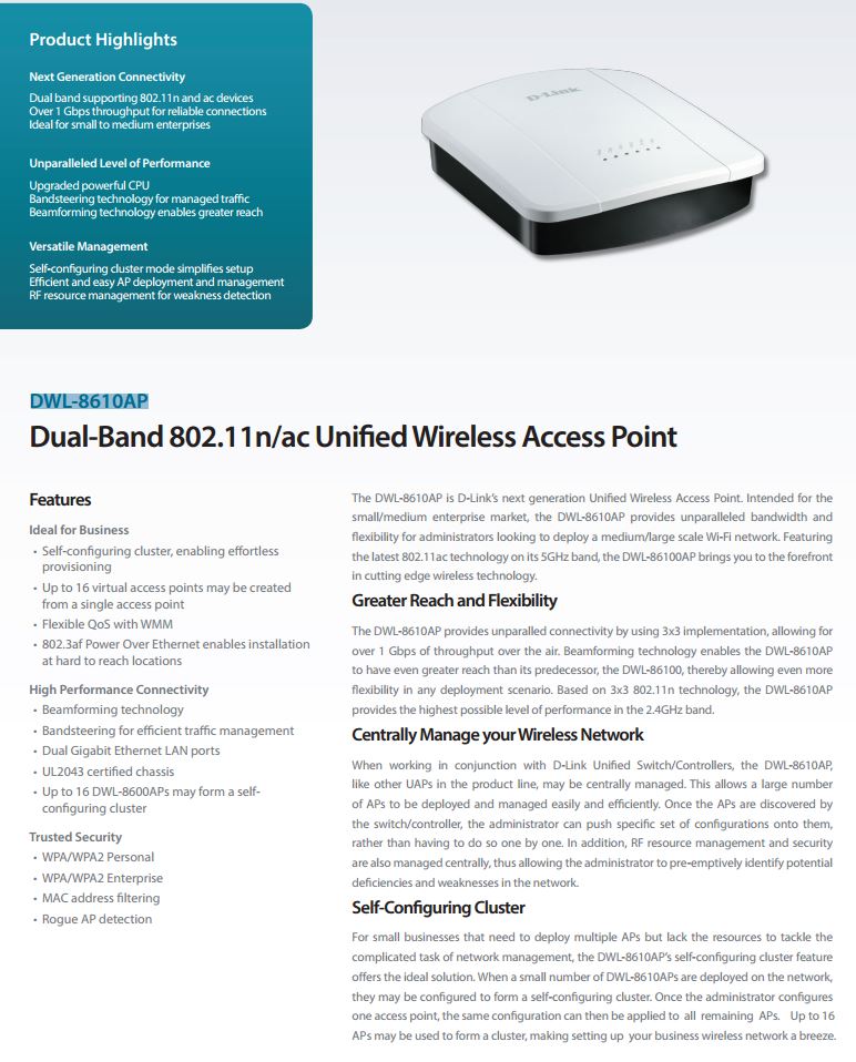 Product Name | D-Link DWL-8610AP Dual Band 802.11N/AC Unified Wireless Access Point |