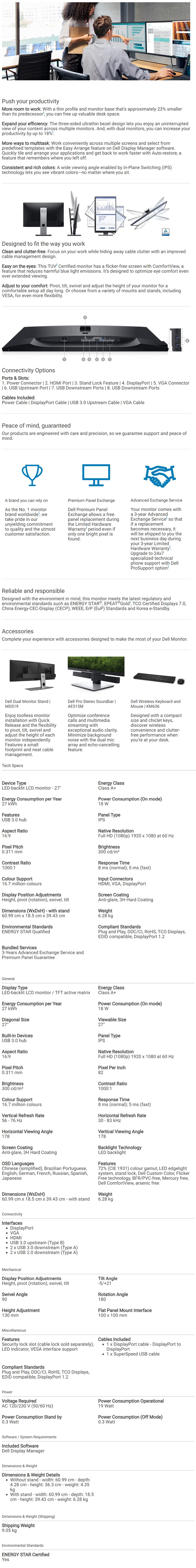 Dell P-Series 27" P2719H Full HD IPS WLED Monitor - Full HD Native Resolution (1920x1080) - 16:9 Native Aspect Ratio - 8ms Response Time - VGA, HDMI, Display Port, USB 3.0 HUB - 300 cd/m2 - 1000:1 Typical Contrast Ratio - 16.7 Displayable Colours (8-bit) - Tilt, Pivot, Swivel & Height Adjustable - VESA - P2719H - 3 Years Limited Warranty