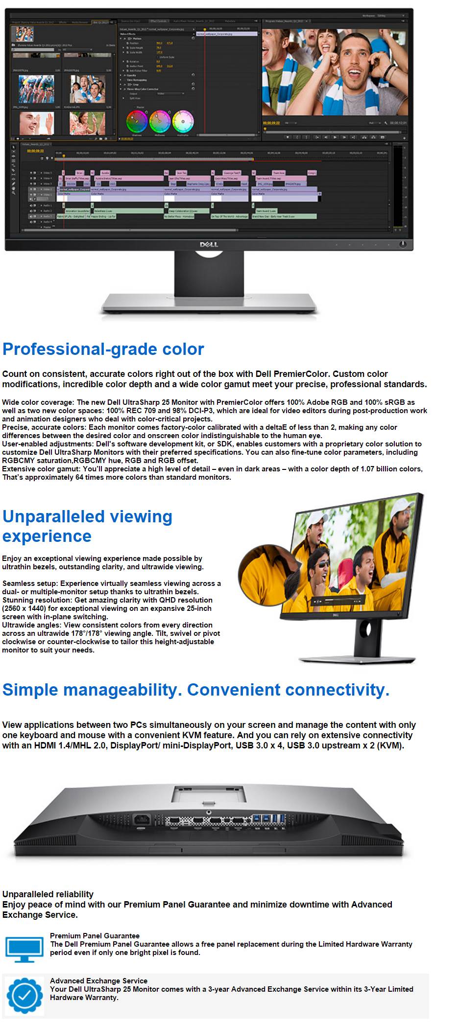 Dell UltraSharp UP2516D 25" WQHD IPS Professional Monitor - 25" (2560 x 1440, 60Hz) - Contrast Ratio: 1000 to 1 (typical), 2000 to 1 (DCR) - Brightness: 300 cd/m2 (typical) - Response Time: 6ms fast mode GTG - Max Viewing Angle: 178 degrees vertical and horizontal - 1x DisplayPort, 1x mini DisplayPort, 2x HDMI (MHL), 4x USB3 with one charging port, 2x USB3 upstream - 3 Year Warranty
