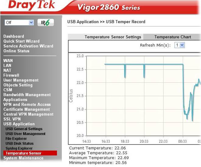 Draytek DT201U USB Thermometer 24hr Graph Temperature display Alarm Thresholds Email & SMS Reporting 1m cable for Vigor2860 2825 2960 3900 300B Series 24-hour graph Temperature display Min/Max 24 hrs monitor Alarm Max/Min Thresholds Continuous Reporting to syslog Syslog Reporting Email & SMS Reporting on threshold breach USB Extension cable included (1M) Mounting hole (for fixing or hanging) 1 years back to base warranty