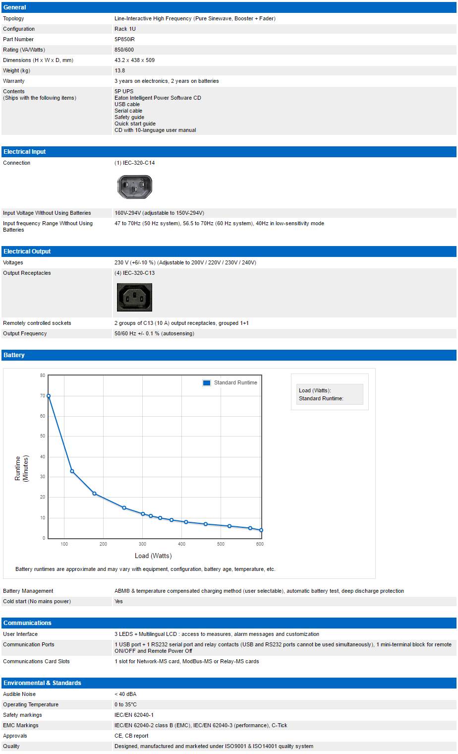 Product Name | Eaton 5P 850VA / 600W Line Interactive 1U Rackmount UPS - 5P850iR |