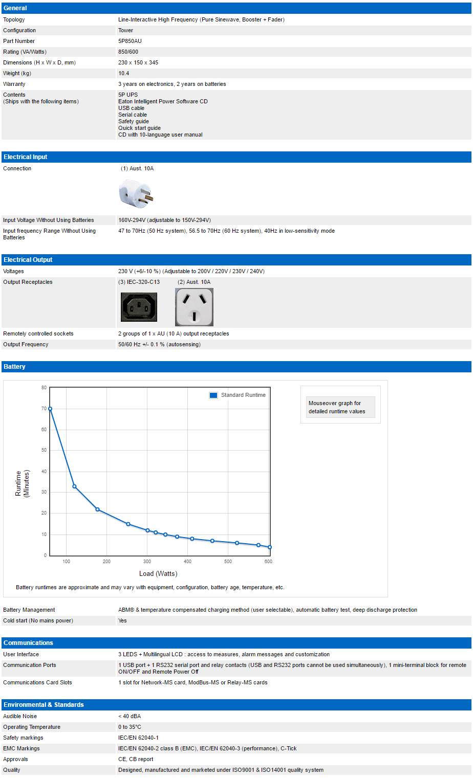 Product Name | Eaton 5P 850VA / 600W Line Interactive Tower UPS - 5P850AU |