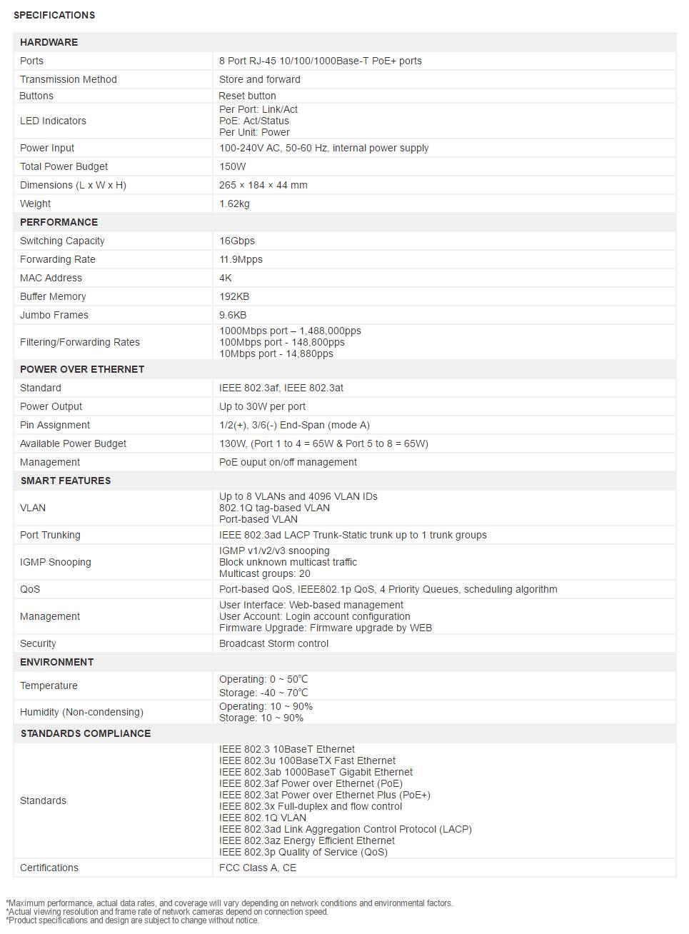 Description Edimax 8X Gbe Poe+ Switch 150W; 4X Gbe + 8X Poe+ Ports (GS-5008PL)