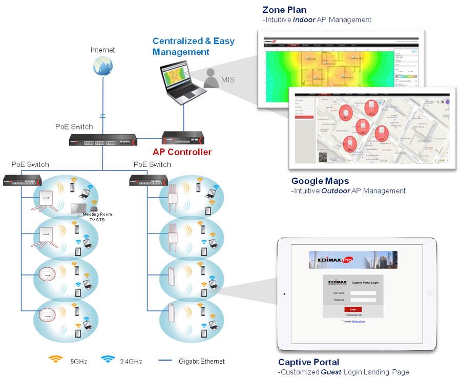 Acting as a central point of management and security, Edimax Pro APC500 with built-in guest access services that can be integrated easily into existing wireless network. To ensure only authorized guests can access the Internet, guests are automatically redirected to the guest login page. This guest captive portal can be customized to the company's look and style - and terms of use can also be displayed.