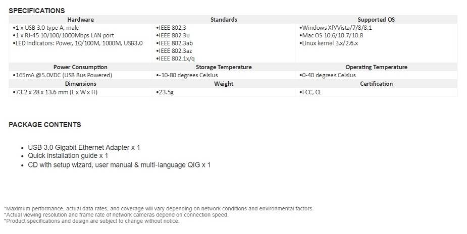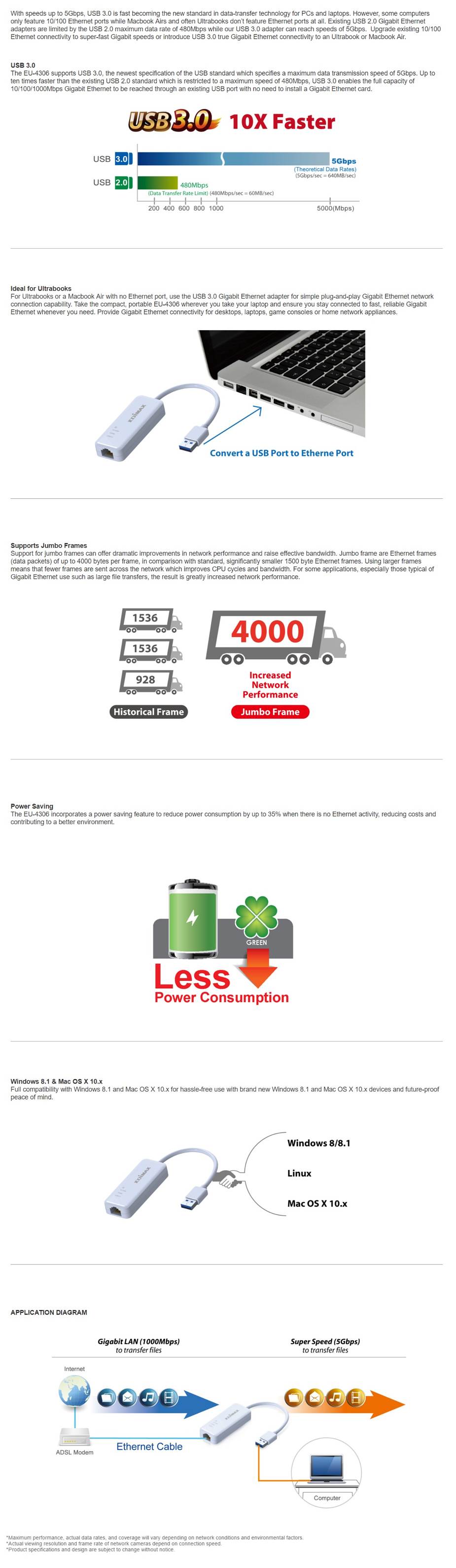 With speeds up to 5Gbps, USB 3.0 is fast becoming the new standard in data-transfer technology for PCs and laptops. However, some computers only feature 10/100 Ethernet ports while Macbook Airs and often Ultrabooks don't feature Ethernet ports at all. Existing USB 2.0 Gigabit Ethernet adapters are limited by the USB 2.0 maximum data rate of 480Mbps while our USB 3.0 adapter can reach speeds of 5Gbps. Upgrade existing 10/100 Ethernet connectivity to super-fast Gigabit speeds or introduce USB 3.0 true Gigabit Ethernet connectivity to an Ultrabook or Macbook Air. USB 3.0 The EU-4306 supports USB 3.0, the newest specification of the USB standard which specifies a maximum data transmission speed of 5Gbps. Up to ten times faster than the existing USB 2.0 standard which is restricted to a maximum speed of 480Mbps, USB 3.0 enables the full capacity of 10/100/1000Mbps Gigabit Ethernet to be reached through an existing USB port with no need to install a Gigabit Ethernet card. Ideal for Ultrabooks For Ultrabooks or a Macbook Air with no Ethernet port, use the USB 3.0 Gigabit Ethernet adapter for simple plug-and-play Gigabit Ethernet network connection capability. Take the compact, portable EU-4306 wherever you take your laptop and ensure you stay connected to fast, reliable Gigabit Ethernet whenever you need. Provide Gigabit Ethernet connectivity for desktops, laptops, game consoles or home network appliances. Supports Jumbo Frames Support for jumbo frames can offer dramatic improvements in network performance and raise effective bandwidth. Jumbo frame are Ethernet frames (data packets) of up to 4000 bytes per frame, in comparison with standard, significantly smaller 1500 byte Ethernet frames. Using larger frames means that fewer frames are sent across the network which improves CPU cycles and bandwidth. For some applications, especially those typical of Gigabit Ethernet use such as large file transfers, the result is greatly increased network performance.