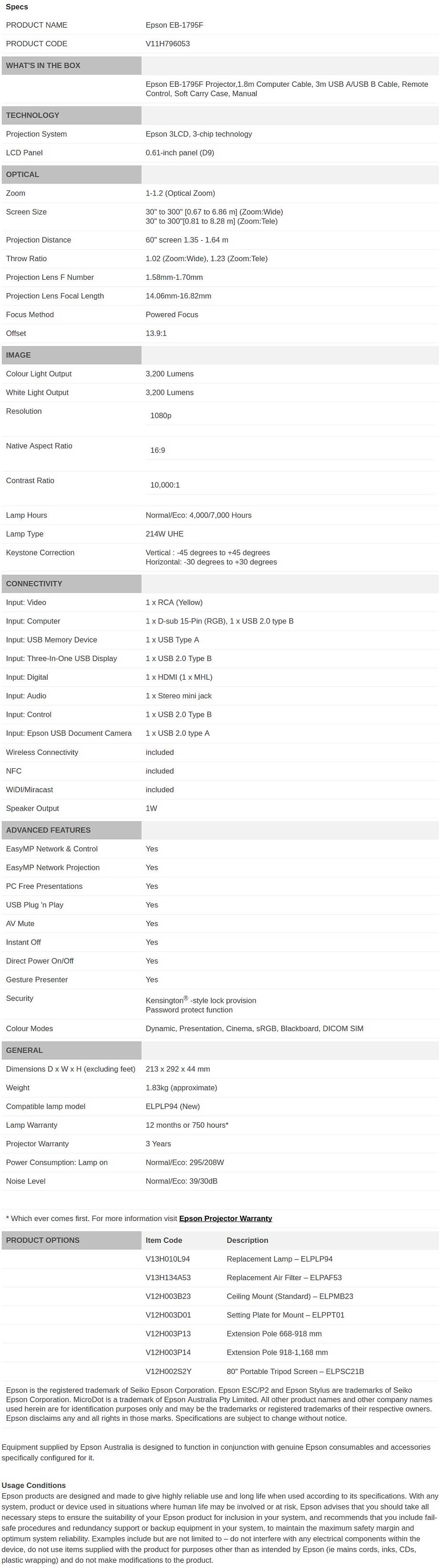 Product Name | Epson EB-1795F Full HD 3LCD Corporate Portable Multimedia Projector |