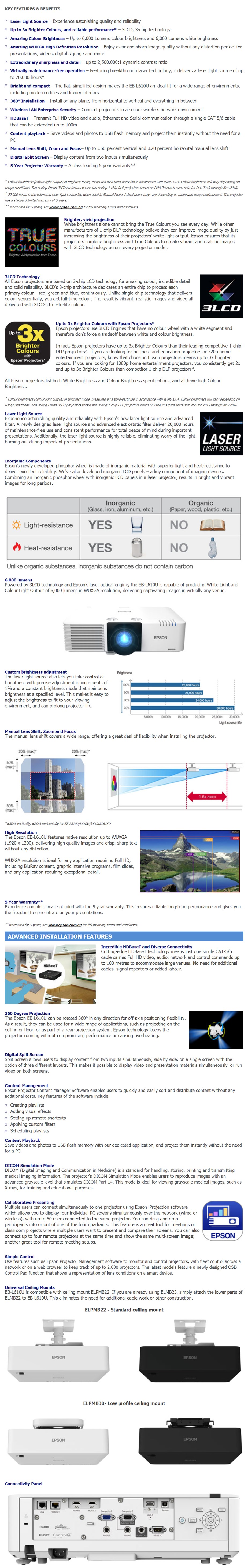 Product Name Epson EB-L610U WUXGA 3LCD Data Laser Projector - White V11H901053
