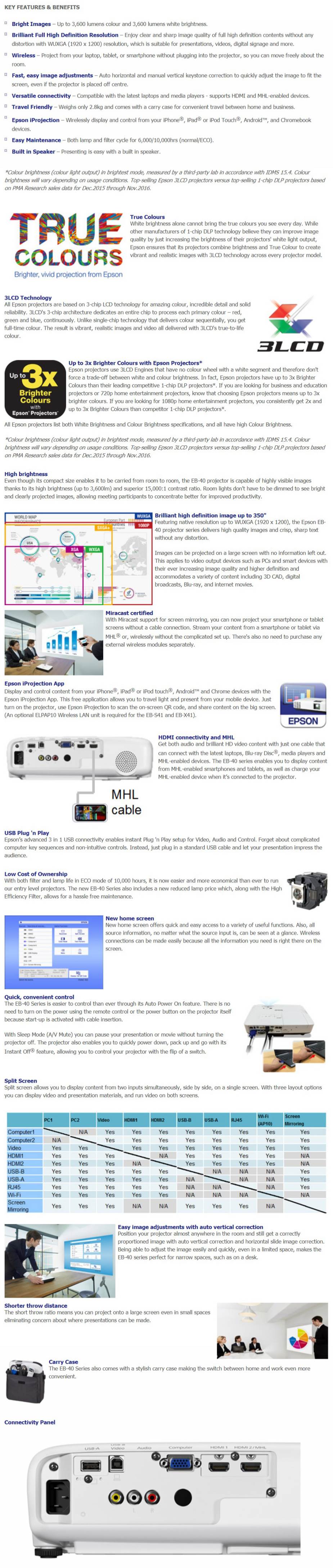Description Epson Eb-u42 Wuxga 3lcd, 3600 Ansi, Hdmi, Usb Plug N Play, Mhl 15,000:1 Contrast Split Screen