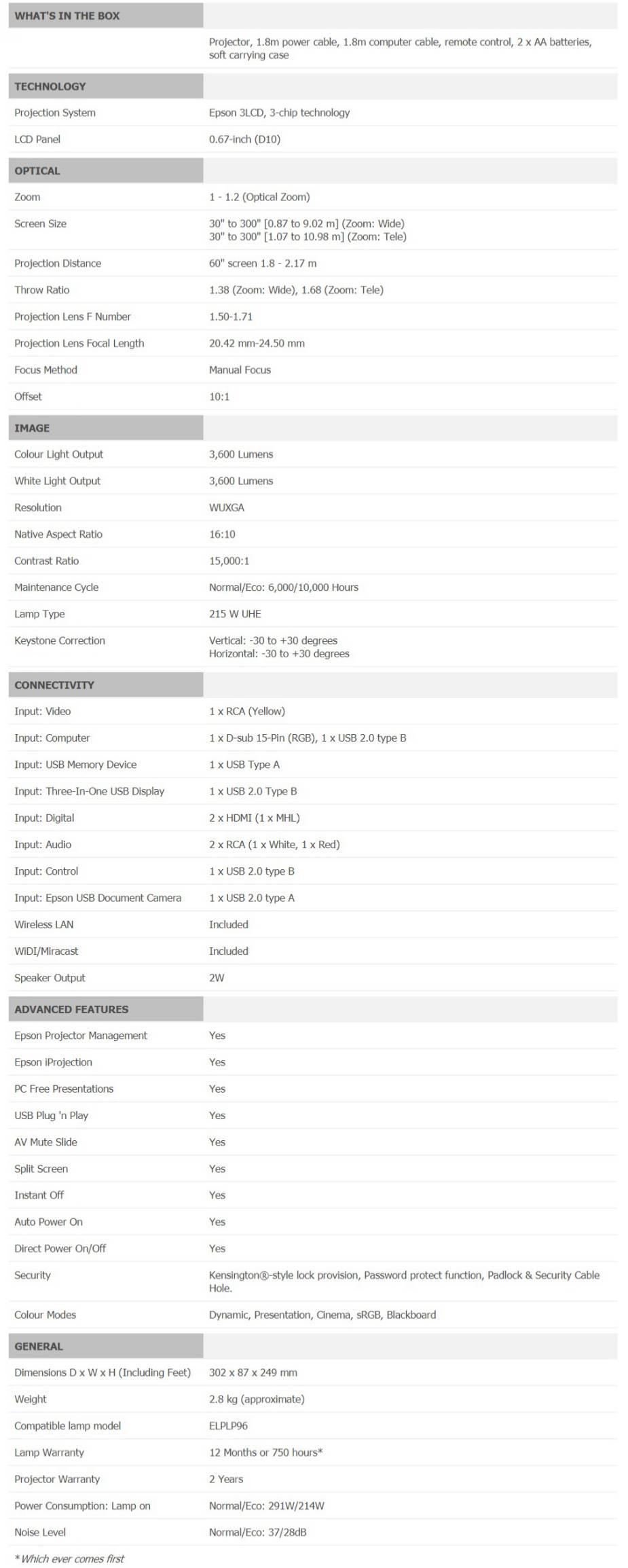 • Bright Images – Up to 3,600 lumens colour and 3,600 lumens white brightness.