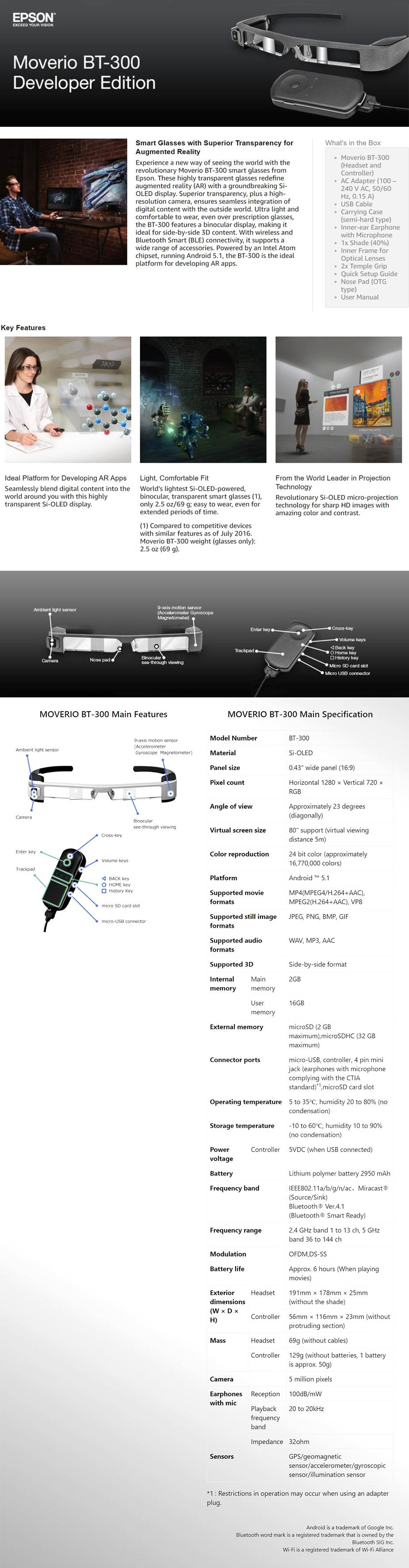 Epson Moverio BT-300 Smart Glasses - Si-OLED Display - Intel Atom 5 1.44GHz Quad Core - Android 5.1 - 720P resolution (1280x720) - Wi-Fi and Bluetooth connectivity - 5MP HD Camera - Built-in motion tracker - GPS/magnetic/accelerometer/gyro sensors - MicroSDHC card slot (Supports up to 32GB) - Fully transparent display - V11H756053 - 12 Months Limited Warranty