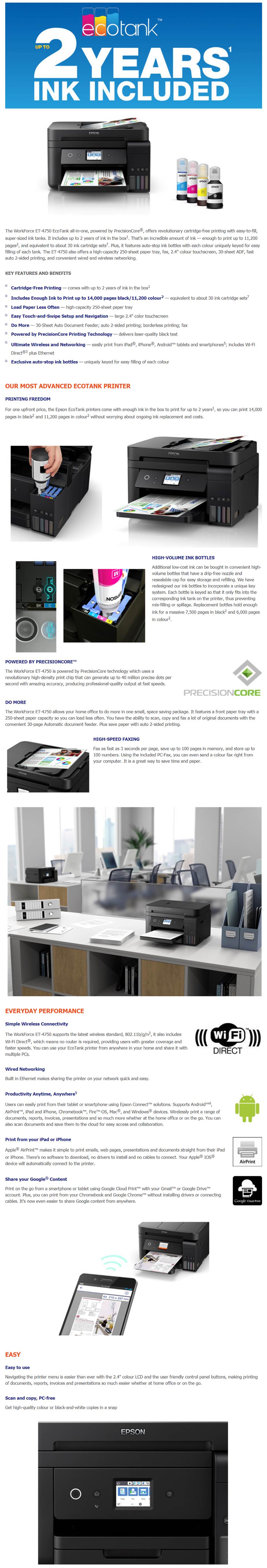 Product Name | Epson Workforce ET-4750 EcoTank Colour A4 Multifunction Wireless Inkjet Printer |