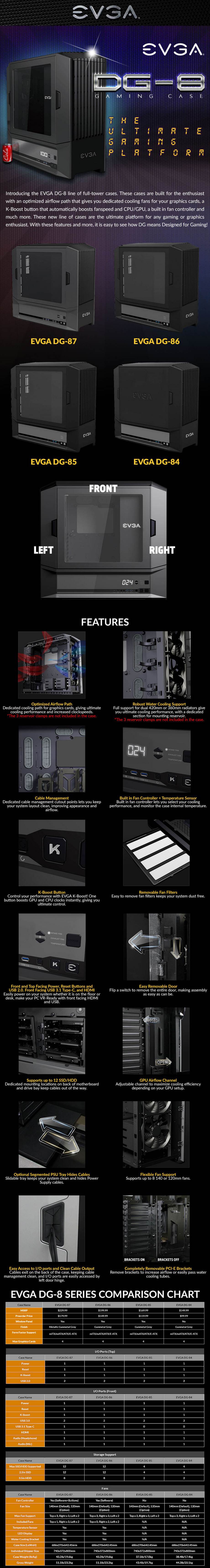 Introducing the EVGA DG-8 line of full-tower cases. These cases are built for the enthusiast with an optimized airflow path that gives you dedicated cooling fans for your graphics cards, a k-Boost button that automatically boosts fanspeed and CPU/GPU, a built in fan controller and much more. These new line of cases are the ultimate platform for any gaming or graphics enthusiast. With these features and more, it is easy to see how DG means Designed for Gaming!
