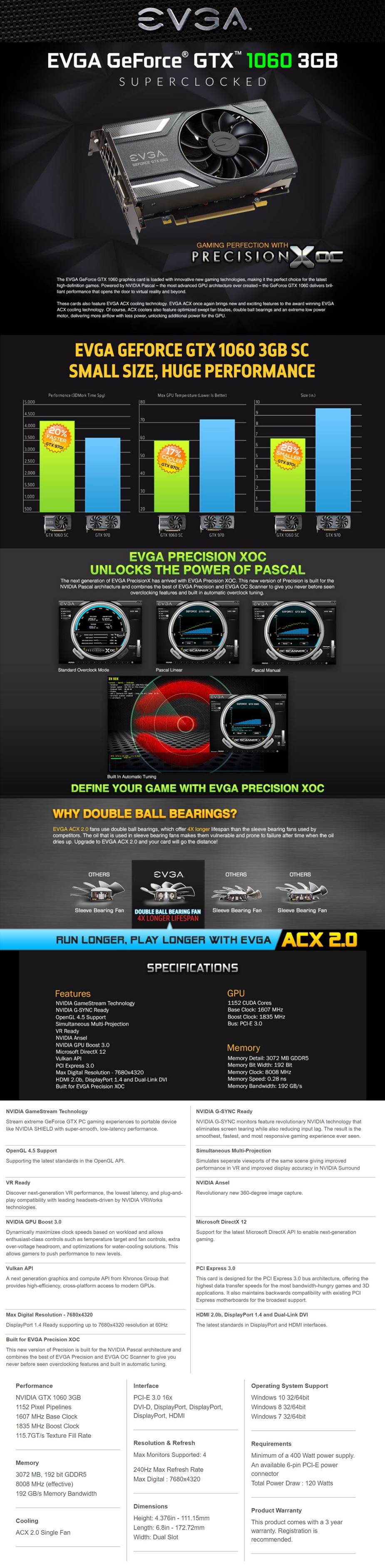 Evga Geforce Gtx1060 Sc Gaming Graphics Card, 3gb Gddr5, Pcie, Full Height, Acx 2.0 (single Fan), Dvi-d, Dp X3, Hdmi, Max 4 Outputs
