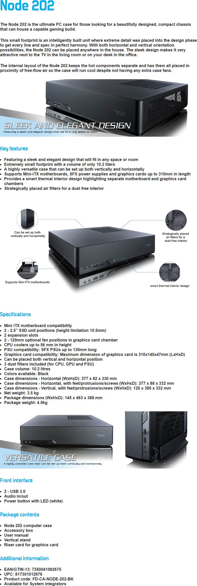 Fractal Design Node 202 Mini-ITX Mini Tower Case - Black - 2x 2.5" SSD mounts - 2 Expansion Slots - Cooling: 2x 120mm (optional) - Front IO: 2x USB 3.0, Audio in/out - Mini ITX motherboard compatibility - SFX PSUs up to 130mm long, CPU coolers up to 56 mm in height - 12 Months Limited Warranty
