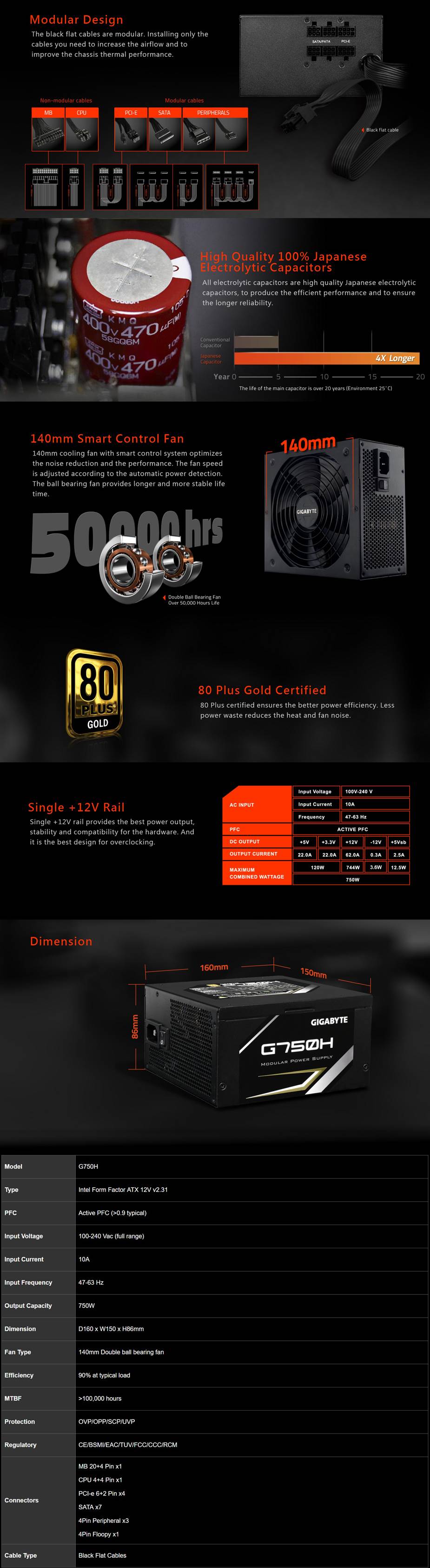 Gigabyte G750H 750W ATX PSU Power Supply 80+ Gold >90% 140mm Fan Modular Black Flat Cables Single +12V Rail Japanese Capacitors >100K Hrs MTBF