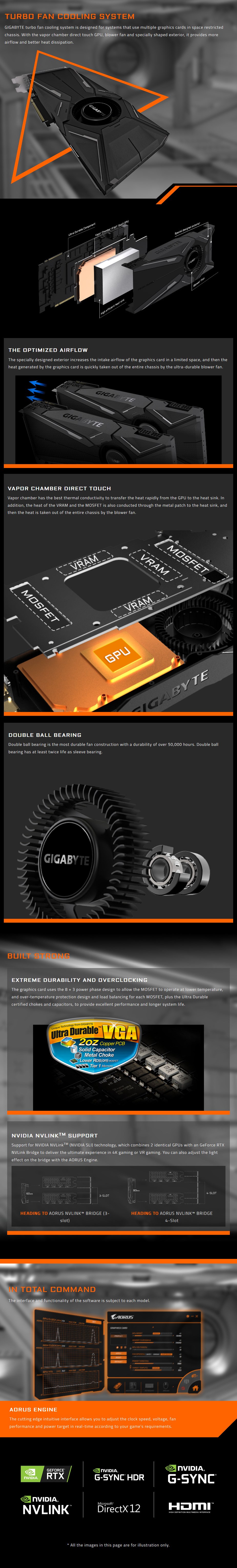 Gigabyte GeForce RTX 2080 Ti Turbo 11GB Video Card - Interface: PCI-E 3.0 x 16 - CUDA Cores: 4352 - Core Clock: 1545 MHz - RTX-OPS: 76 - Memory Clock: 14000 MHz - Memory Type: 11GB, GDDR6 - DirectX 12 - OpenGL 4.5 - Output: 3x DisplayPort 1.4 -, 1x HDMI 2.0b & USB Type-C - Recommended PSU: 750W - SLI Support: 2-Way NVIDIA NVLINK - Turbo Fan Cooling System - Vaper Chamber Direct Touch GPU - GV-N208TTURBO-11GC - 3 Years Limited Warranty