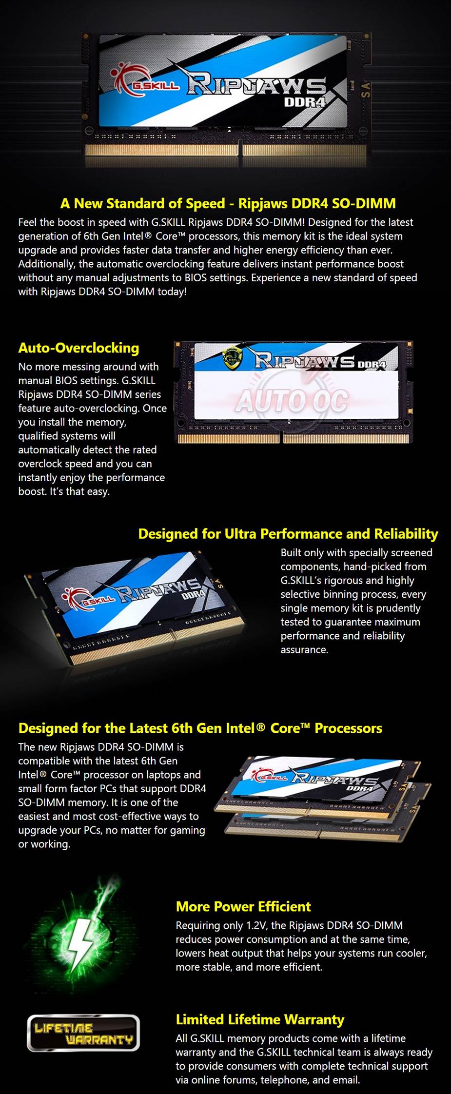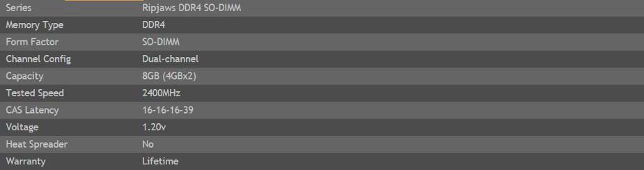 Product Name | G.Skill DDR4-2400 8Gb Dual Channel Ripjaws SODIMM [F4-2400C16D-8GRS] |