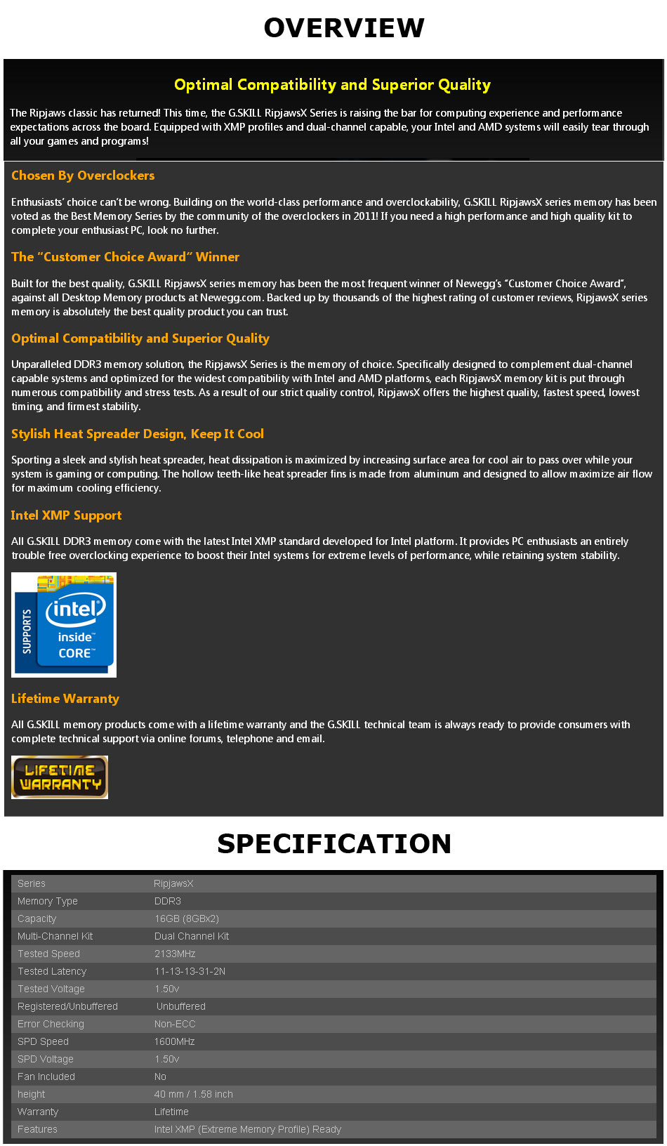 Product Name | G.Skill F3-2133C11D-16GXL RipjawsX 16GB (2x 8GB) DDR3 2133MHz Memory |