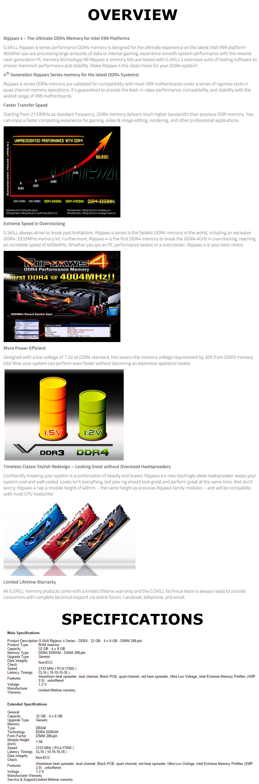 Features | DDR4 memory is designed for the ultimate experience on the latest Intel X99 platform! Whether you are processing large amounts of data or intense gaming, experience smooth system performance with the newest next-generation PC memory technology! All Ripjaws 4 memory kits are tested with G.SKILL’s extensive suite of testing software to ensure maximum performance and stability. |
