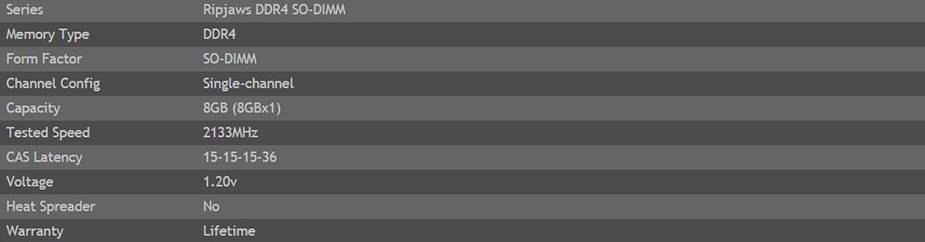 Product Name | G.Skill Ripjaws 8GB (1x 8GB) DDR4 2133MHz SODIMM Memory |