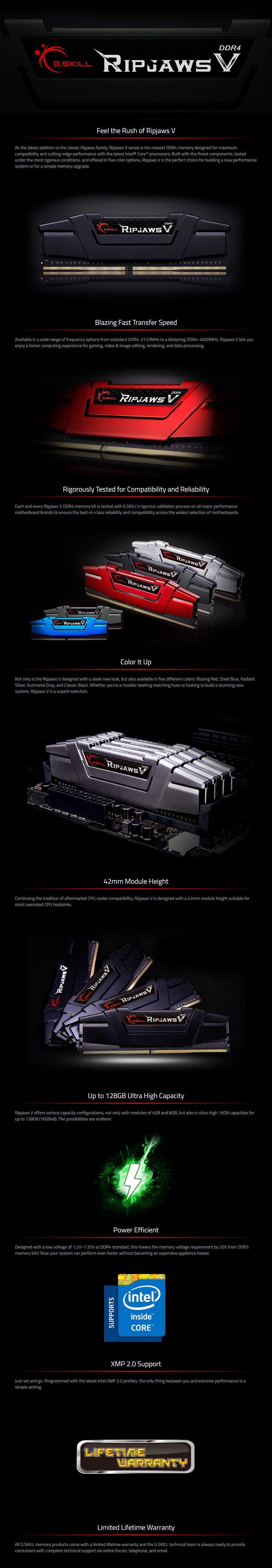 G.Skill Ripjaws V 32GB (1x 32GB) DDR4 2666MHz CL18 Memory - Black - Speed: 2666MHz - Total Capacity: 32GB (1x 32GB) - 42mm Modular Height - Voltage: 1.2V - Latency: CL18-18-18-43 - Unbuffered - Non-ECC - Intel XMP 2.0 (Extreme Memory Profile) Ready - F4-2666C18S-32GVK - Limited Product Lifetime Warranty