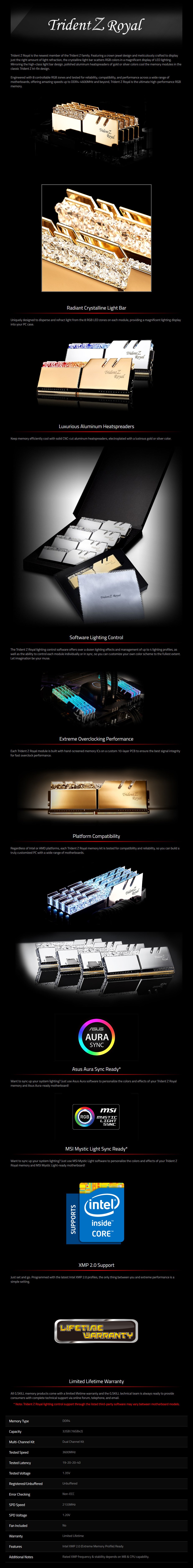 G.Skill Trident Z RGB Royal 32GB (2x 16GB) DDR4 CL19 3600MHz Memory - Silver - Dual Channel - Capacity: 32GB (16GB x2) - Speed: 3600MHz - Latency: 19-20-20-40 - Voltage: 1.35V - Unbuffered - Non-ECC - Intel XMP 2.0 Support - Full range RGB Support - RGB LED Crystalline Light Bar - F4-3600C19D-32GTRS - Limited Product Lifetime Warranty