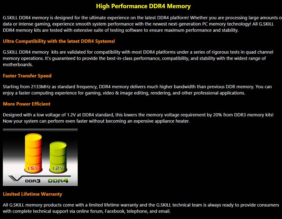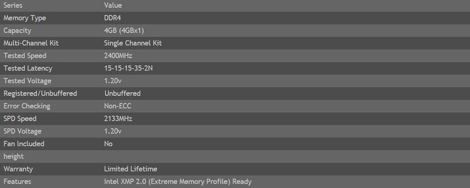 Product Name | G.Skill Value 4GB (1x 4GB) DDR4 2400MHz Memory F4-2400C15S-4GNT |