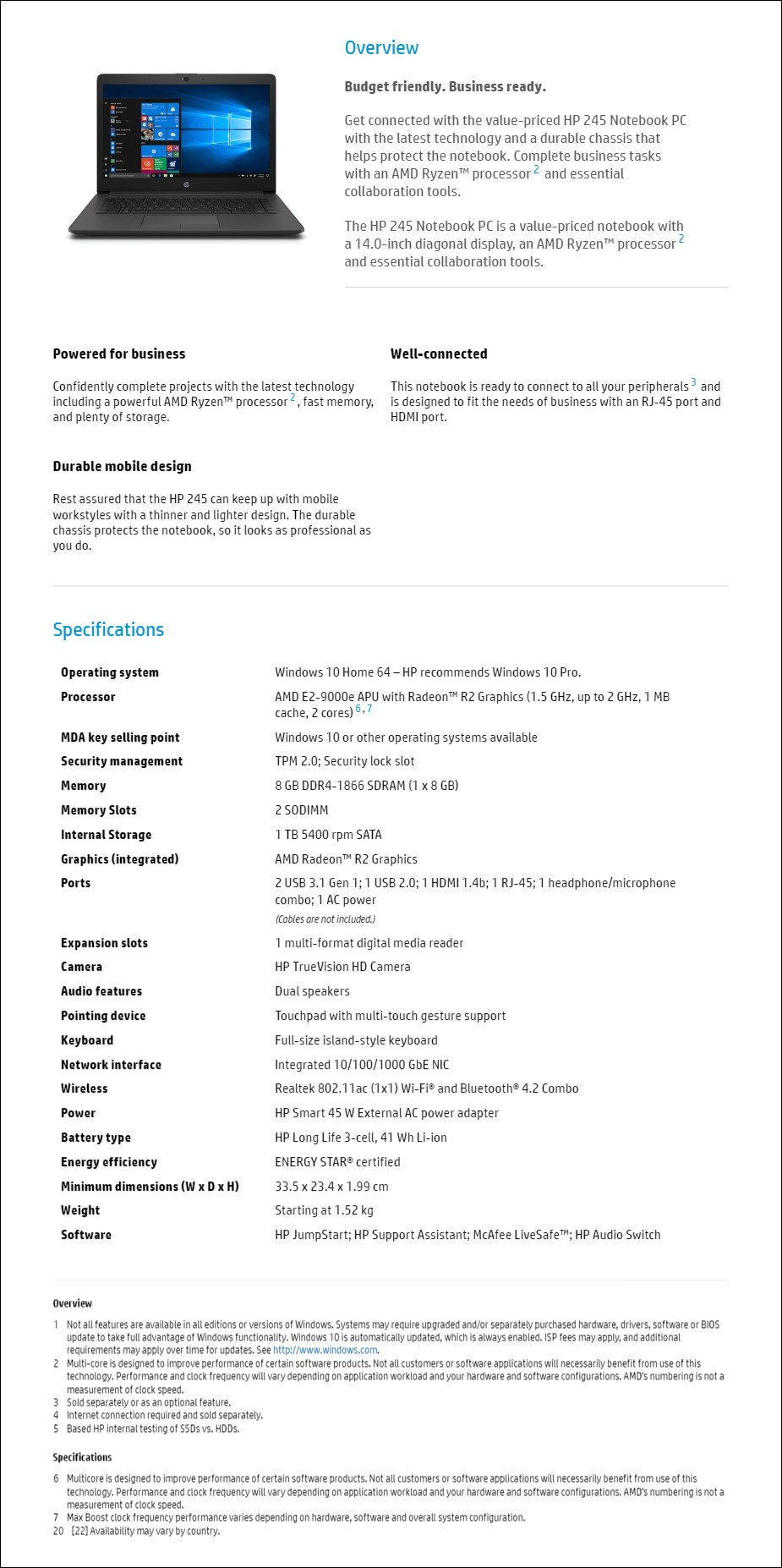 Product Name | HP 245 G7 14" Laptop E2-9000e 8GB 1TB HDD W10H 6VZ52PA |