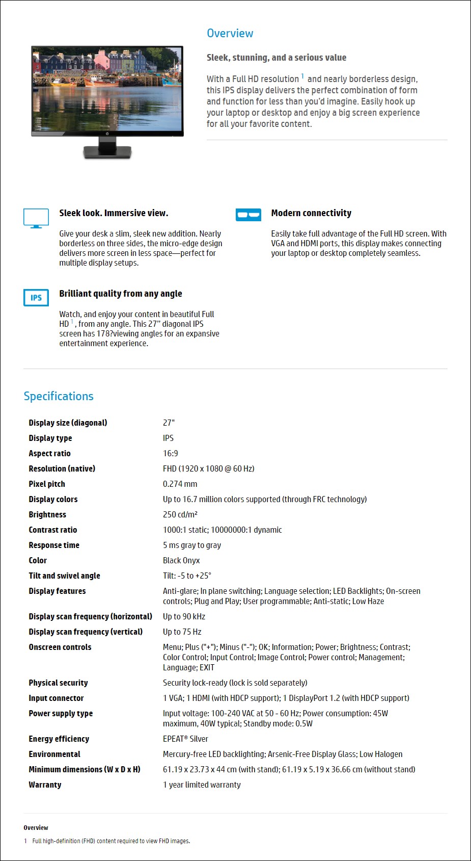 HP 27w 27" Full HD Anti-Glare IPS Monitor - Native Resolution: Full HD (1920 x 1080) - Refresh Rate: 60Hz - Aspect Ratio: 16:9 - Panel Type: IPS =- Response Time: 5ms GtG - Brightness: 250 cd/m2 - Contrast Ratio: 1000:1 (Static), 10M:1 (Dynamic) - Tilt Adjustable - Anti-Glare Display - Ports: 1x VGA,1x HDMI & 1x DisplayPort 1.2 (HDCP Support) - Displayable Colours: Up to 16.7 Million (FRC Tech) - VESA Support: No - 1JJ98AA - 12 Months Limited Warranty