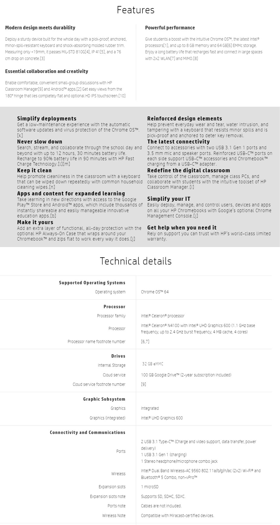 Product Name | HP Chromebook 11 EE G7 11.6" HD Celeron N4100 4GB 32GB ChromeOS Touch |