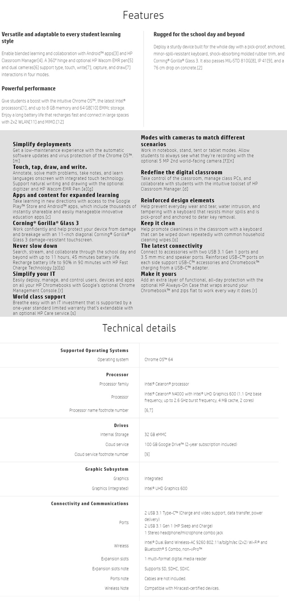 HP Chromebook x360 G2 11.6" HD Celeron N4000 4GB 32GB ChromeOS Touch - Display: 11.6" HD IPS, 1366 x 768 - CPU: Intel Celeron N4000 - RAM: 4GB LPDDR4 - Storage: 32GB eMMC - Graphics: Intel UHD graphics 600 - Network: Intel® Dual Band Wireless-AC 9260 802.11a/b/g/n/ac Wi-Fi and Bluetooth 5 Combo - 2x USB-C, 2x USB3.1 - ChromeOS - 6ZH21PA - 12 Months Limited Warranty
