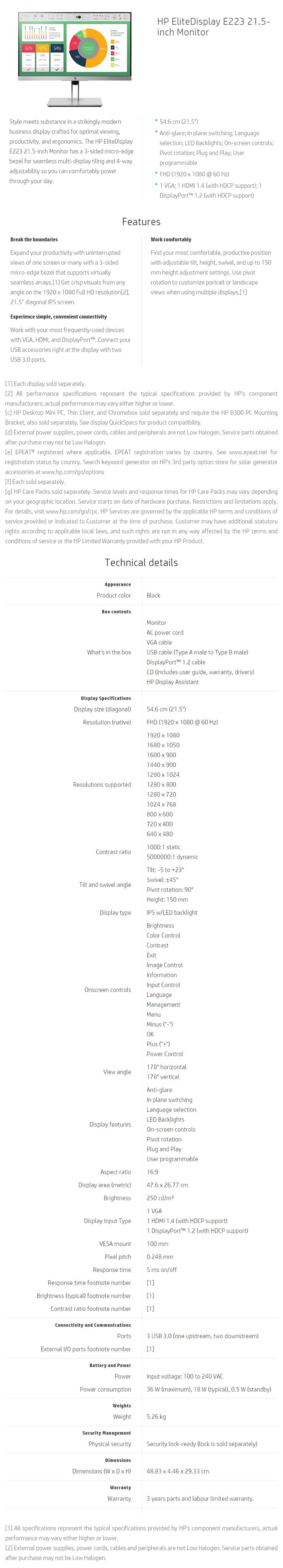 Product Name | HP EliteDisplay E223 21.5" FHD IPS LED Monitor |