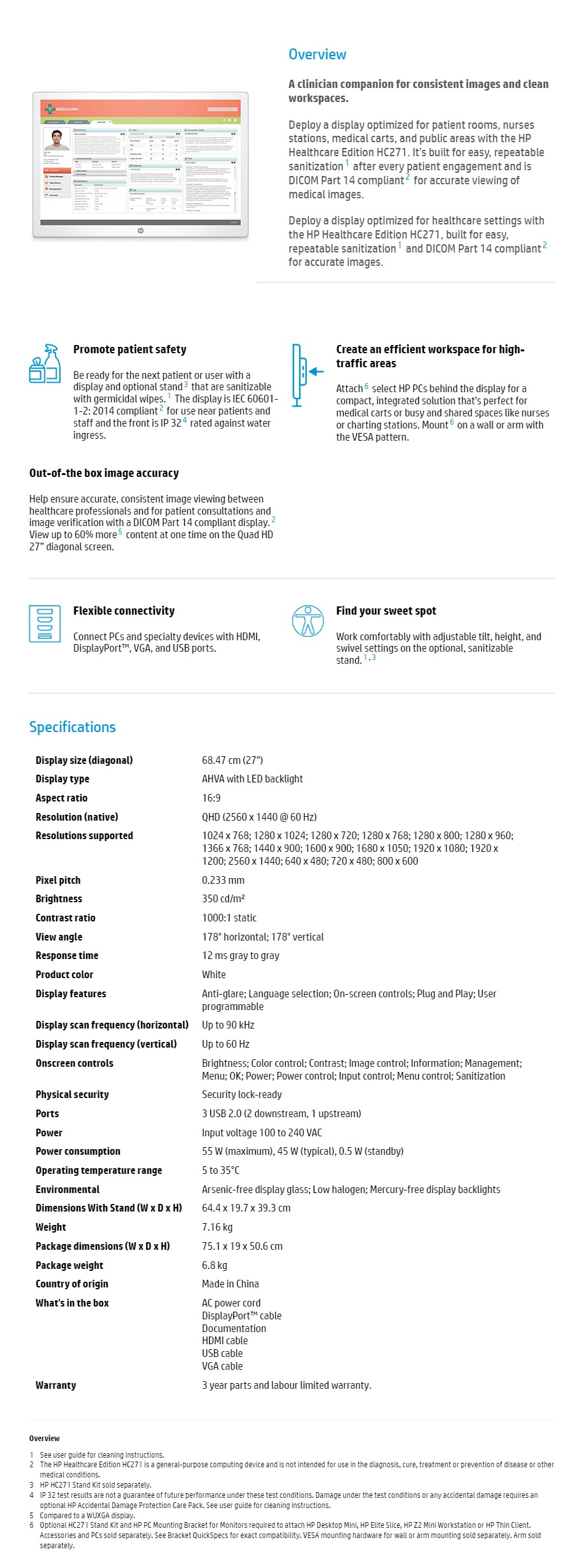 HP Healthcare Edition HC271 27" QHD Clinical Review Monitor - Stand NOT Included - Native Resolution: QHD (2,560 x 1,440) - Refresh Rate: 60Hz - Aspect Ratio: 16:9 - Brightness: 350 cd/m2 - Contrast Ratio: 1,000:1 (Static) - Response Time: 12ms GtG - Panel Type: AHVA - Input: 1x DisplayPort 1.2, 1x HDMI 1.4 & 1x VGA - HDCP Support - Optimized for Healthcare Settings - 3ME70AA - 3 Years Limited Warranty