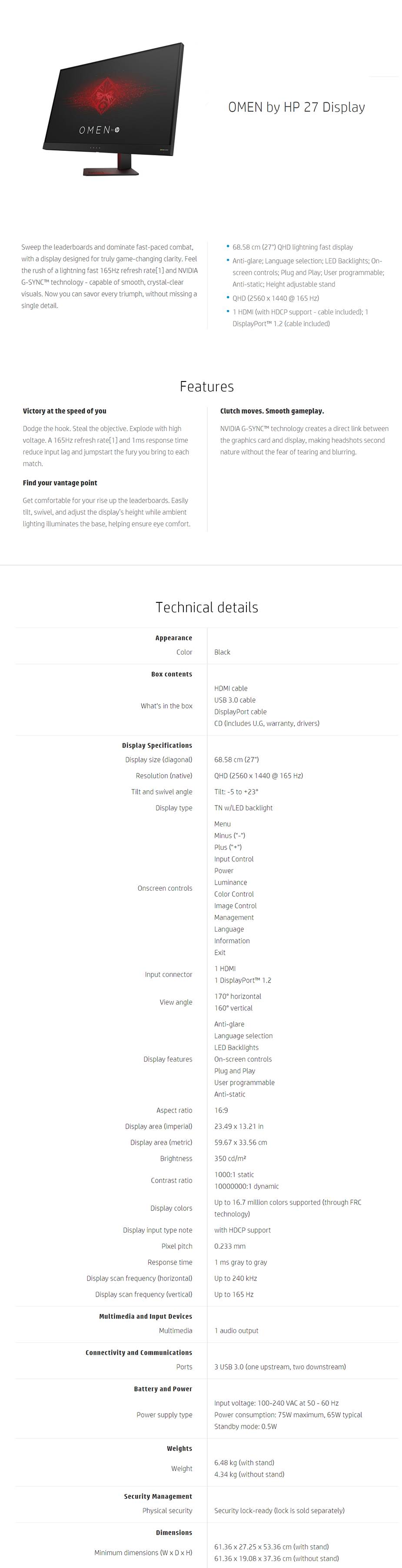 Description HP OMEN 27 Z4D33AA 27" 165Hz QHD 1ms G-Sync Gaming Monitor