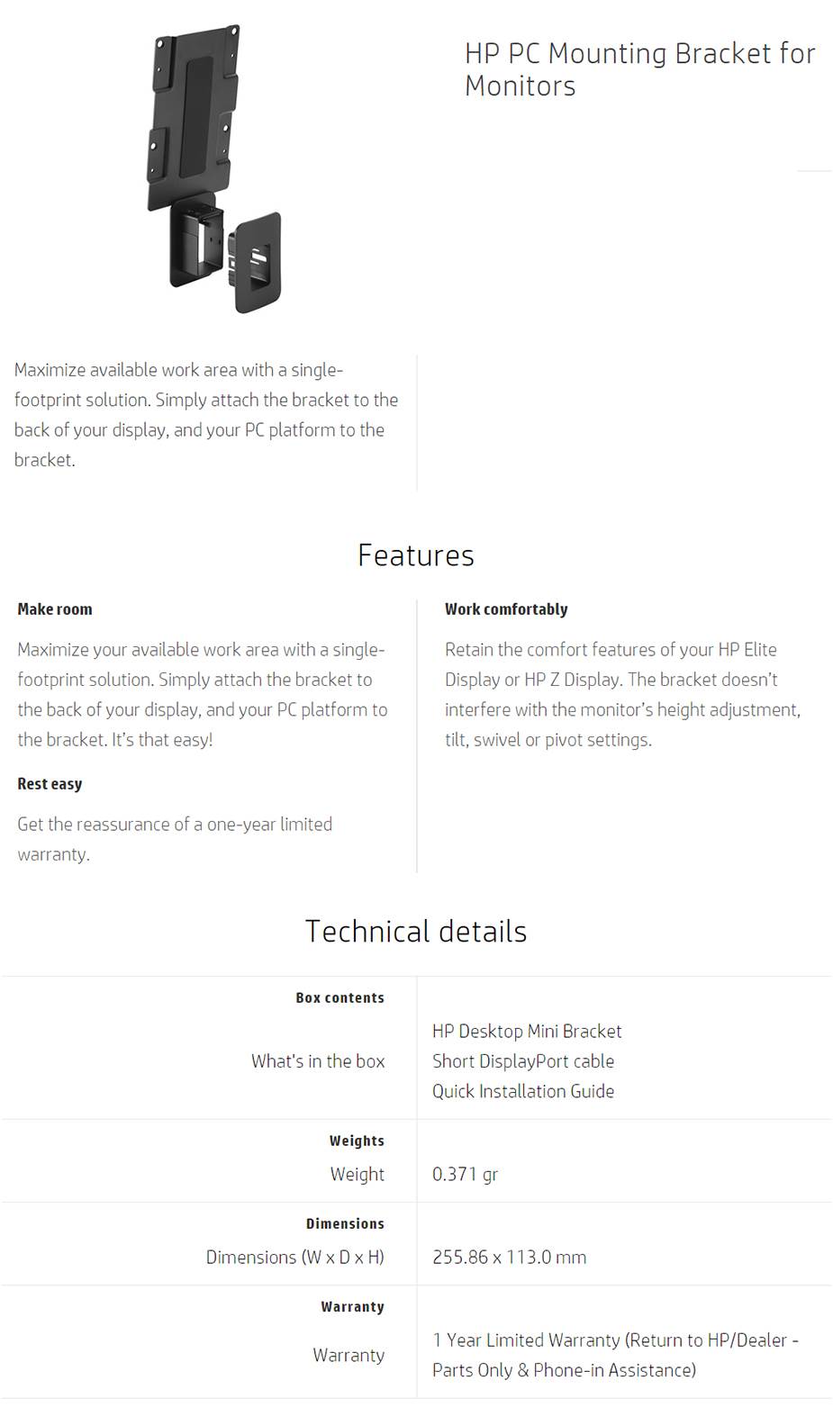Product Name | HP PC Mounting Bracket for Monitors |