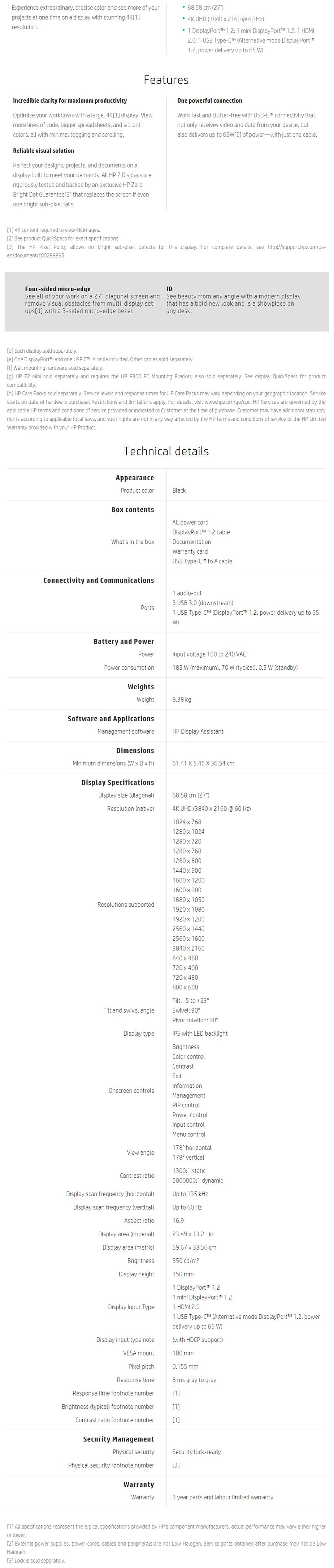 HP Z27 2TB68A4 27" 16:9 4K UHD IPS LED Monitor - Screen: IPS w/LED Backlight - Resolution: 4K UHD (3840x2160 @ 60Hz) - Brightness: 350 cd/m2 - Contrast: 1300:1 Static, 5,000,000:1 Dynamic - Viewing Angles: 178 degrees (H)/178 degrees (V) - Response: 8ms GtG - Connections: 1x HDMI 2.0, 1x DisplayPort 1.2, 1x mini DisplayPort 1.2, 1x USB Type-C Port - 3 Years Limited Warranty
