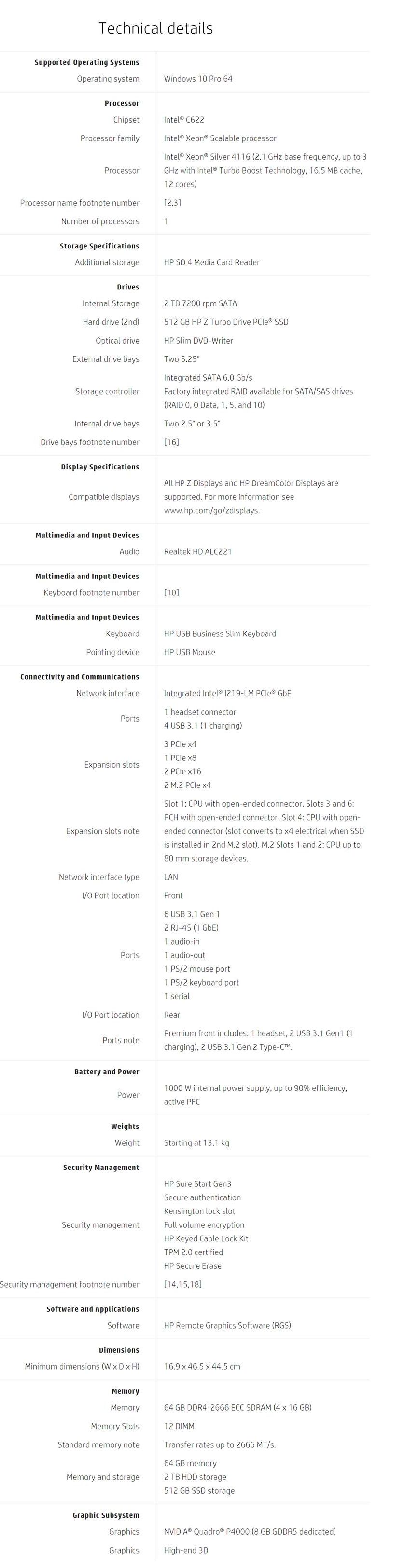 HP Z6 G4 Workstation Xeon Silver 64GB 512GB SSD 2TB Quadro P4000 Win10 Pro - 3FF59PA - Intel® Xeon® Silver 4116 (2.1 GHz base frequency, up to 3 GHz with Intel® Turbo Boost Technology, 16.5 MB cache, 12 cores) - 64 GB DDR4-2666 ECC SDRAM (4x 16GB) - 512 GB HP Z Turbo Drive PCIe SSD - 2 TB 7200 rpm SATA - 3 Years Limited Warranty