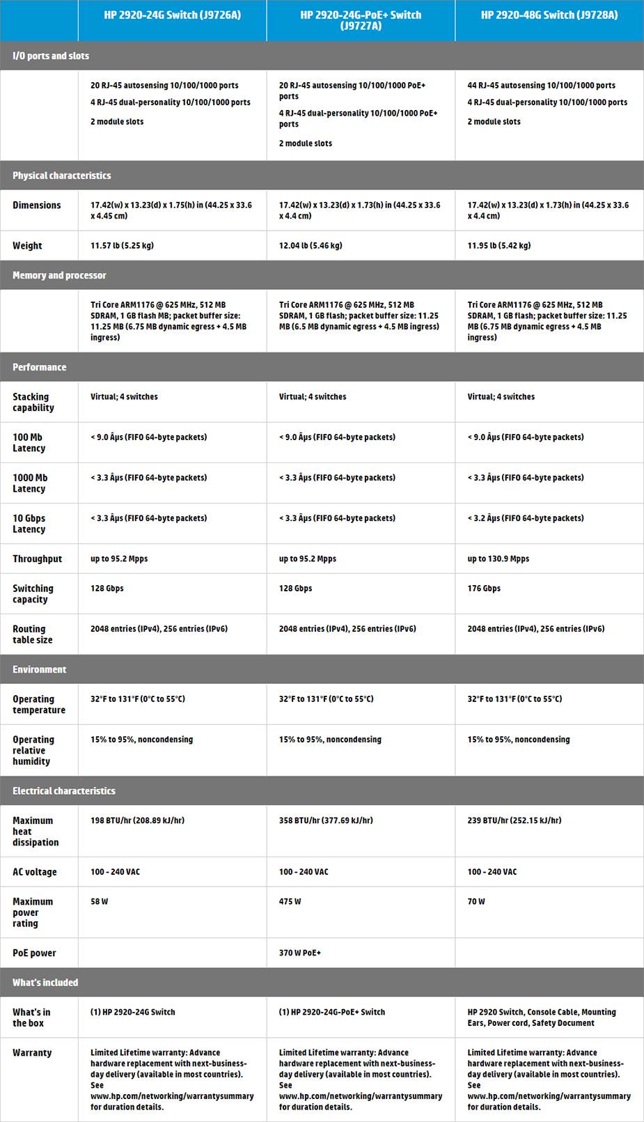 The HP 2920 Switch Series provides security, scalability and ease of use for enterprise edge, SMB and branch office access layer deployments. A powerful HP Networking ASIC delivers low latency, more packet buffering, and adaptive power consumption to this robust Basic Layer 3 switch that supports modular stacking, 10GbE, RIP routing, PoE+, ACLs, sFlow and IPv6.
