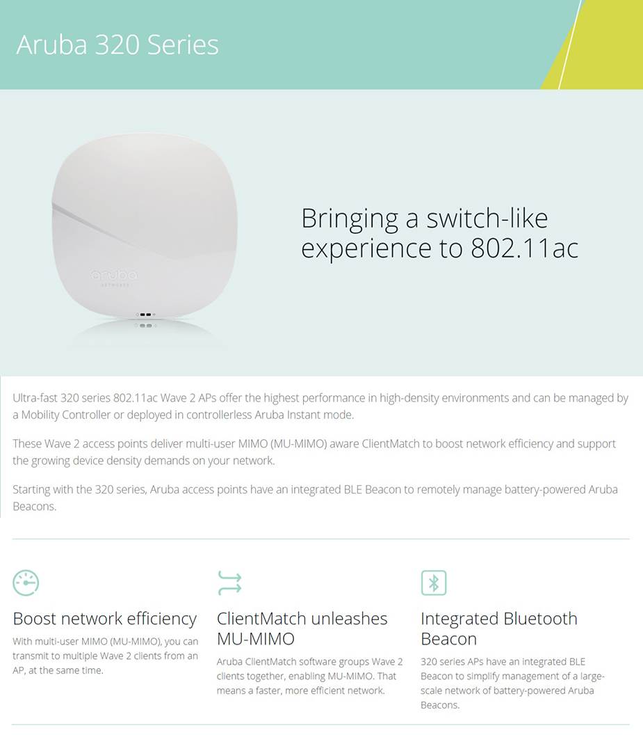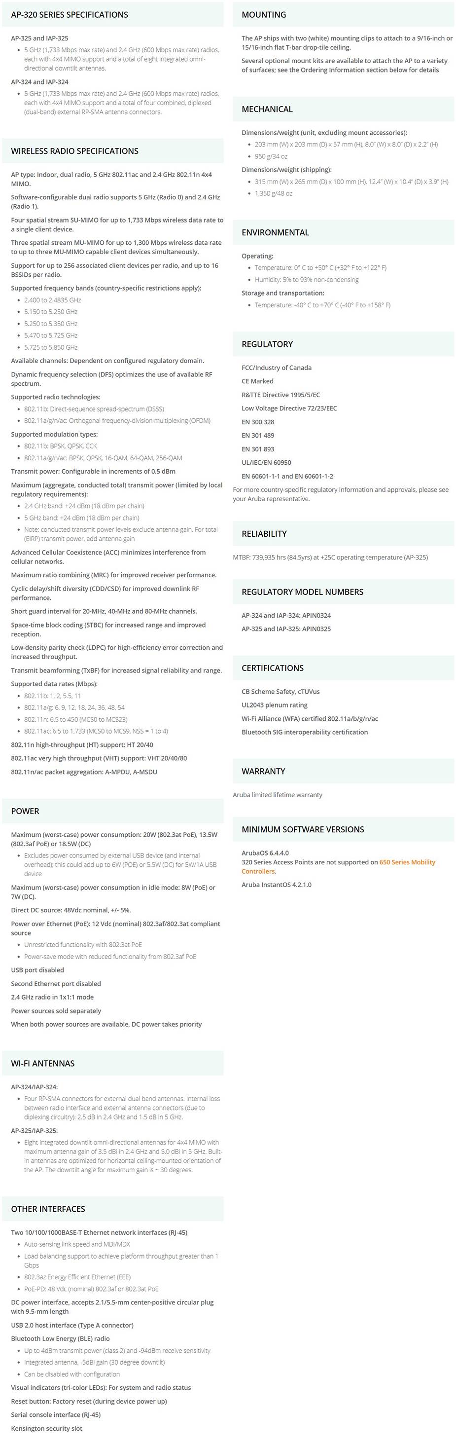 Product Name | HPE Aruba IAP-325 4X4:4 802.11AC PoE Wireless Instant Access Point |